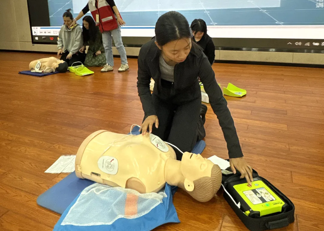 第二环:高质量心肺复苏。红十字会老师详细讲解了心肺复苏的十个具体步骤,并组织教师们分批进行实操练习。通过模拟真实场景,大家逐步掌握了正确的按压位置、深度和频率。
