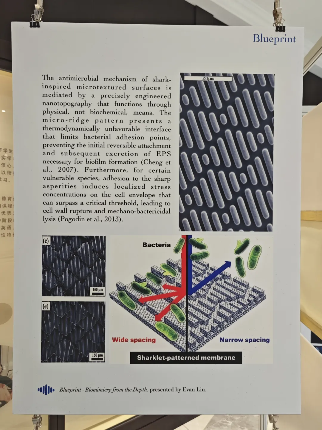 在揭示了危机的根源后,刘铭暄同学话锋一转,将大家的视线引向了浩瀚的海洋。 四亿年来,鲨鱼的体表始终能抵御微生物的附着。 他解释道,这并非因为鲨鱼皮肤具有毒性,而是其微观层面上由无数齿状鳞片(盾鳞)构成的独特拓扑结构,让病原体无法 安家 。他将鲨鱼重新定义为一位 设计大师 ,而非仅仅是顶级掠食者。