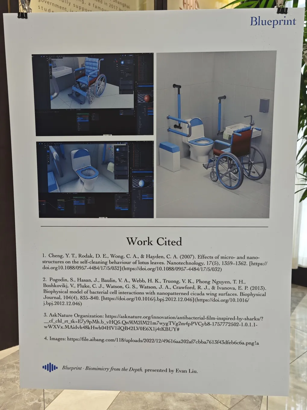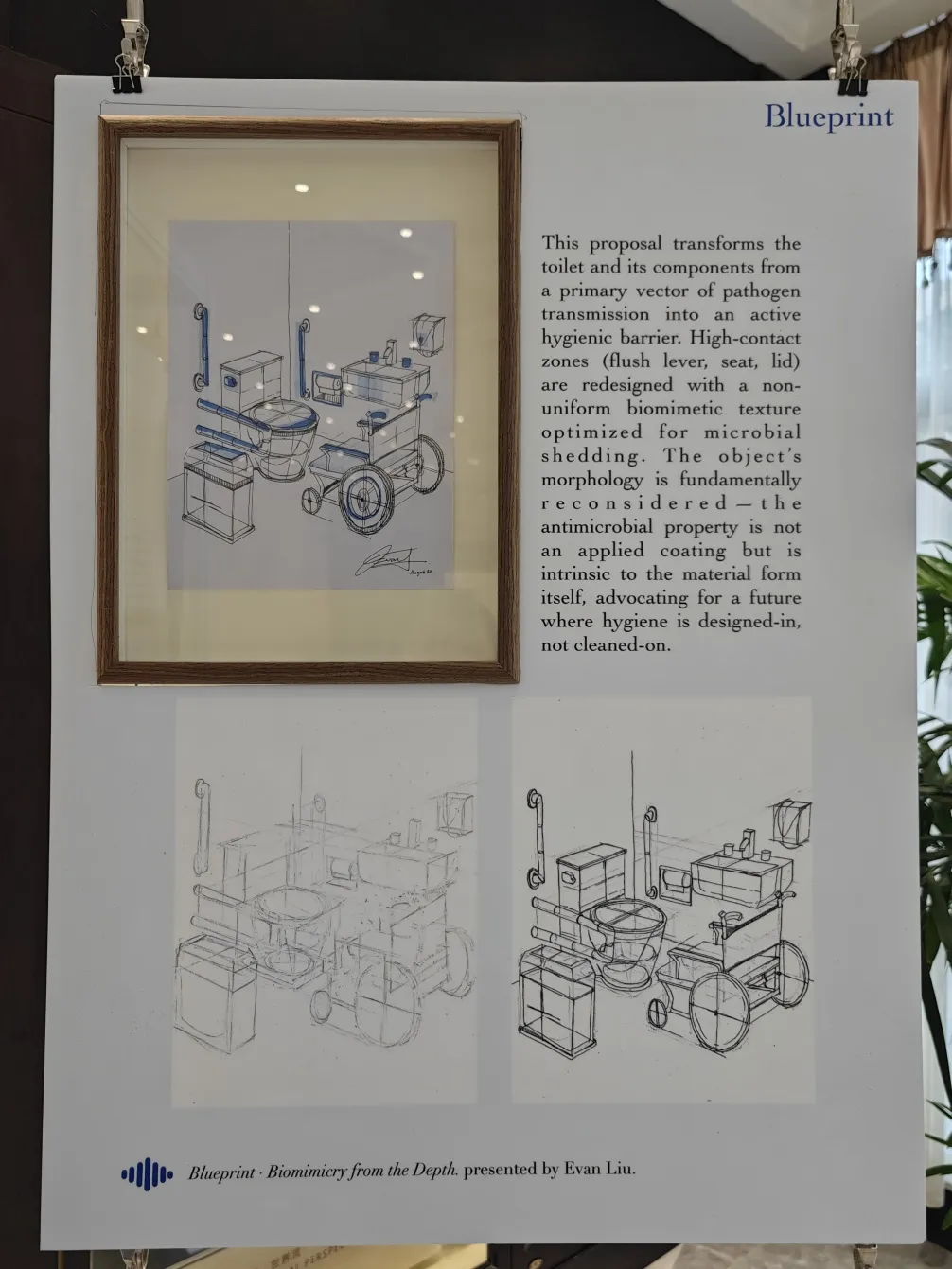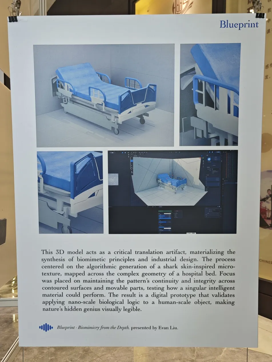 Even more impressive were his bold application concepts. In his redesign, the hospital bed is re-envisioned as "a monolithic, hygienic interface." High-contact zones like bed rails and controls are engineered with a continuous biomimetic texture, preventing the formation of cohesive biofilms at the source. Similarly, critical touchpoints on a toilet were reconceived to promote microbial shedding, making hygiene an innate characteristic of the object's form. Supported by digital models displayed alongside, he clearly demonstrated the feasibility of applying this intelligent material seamlessly to functional objects, his rigor and foresight earning deep admiration from teachers present.