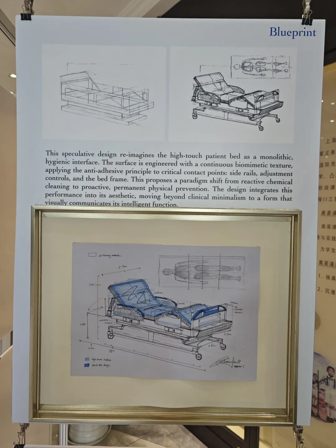 更令人赞叹的是,他将这一原理进行了大胆的应用构想。在他的设计中,医院的病床不再只是等待被清洁,而是变成了 整体式卫生交互界面 ,床栏、控制器等高频接触区域均覆盖上连续的仿生纹理,从源头上阻止细菌生物膜的形成。同样,卫生间马桶的关键接触点也经由设计,能主动促进微生物脱落,让 卫生 成为物件与生俱来的属性。配合展板上展示的数字化模型,他清晰地演示了这项技术在产品上无缝应用的可行性,其严谨性与前瞻性令在场的老师也深感佩服。
