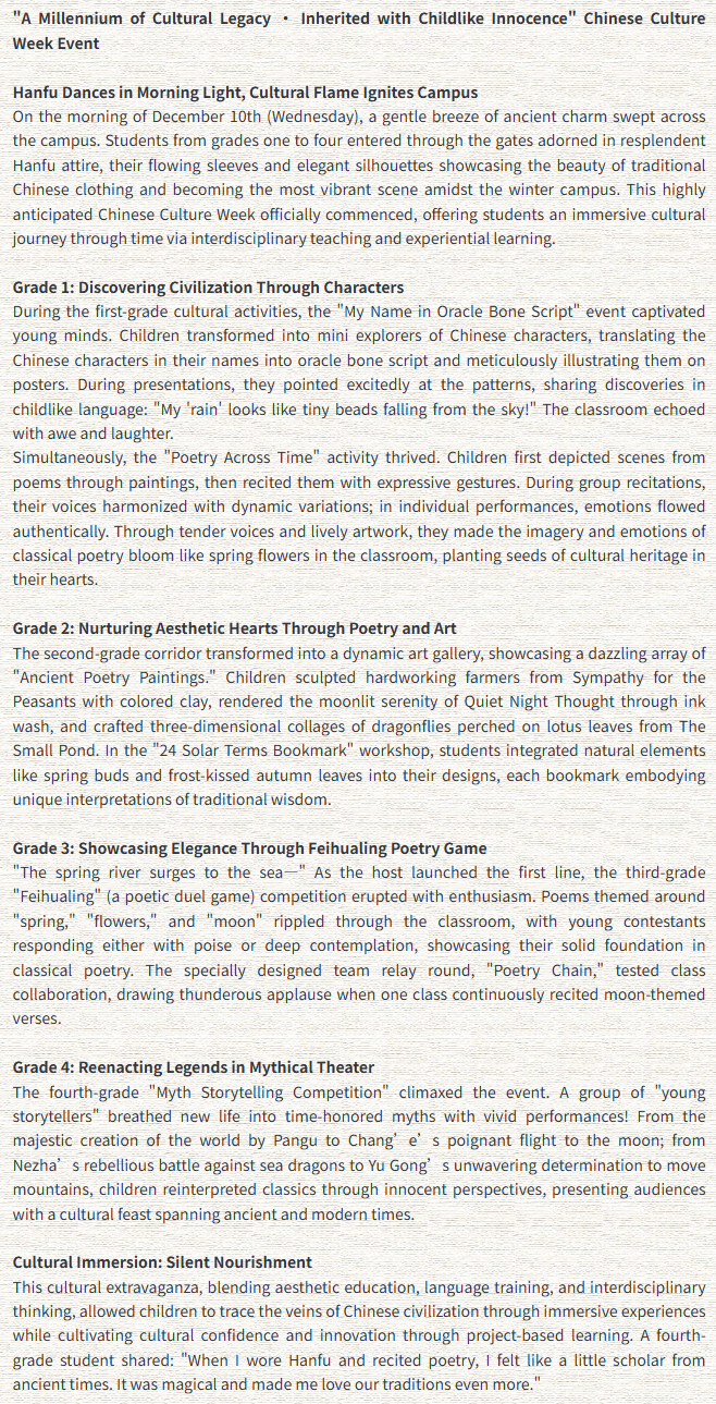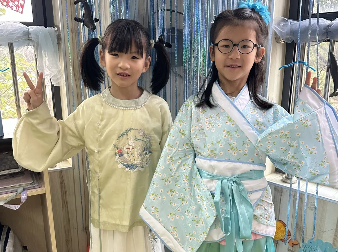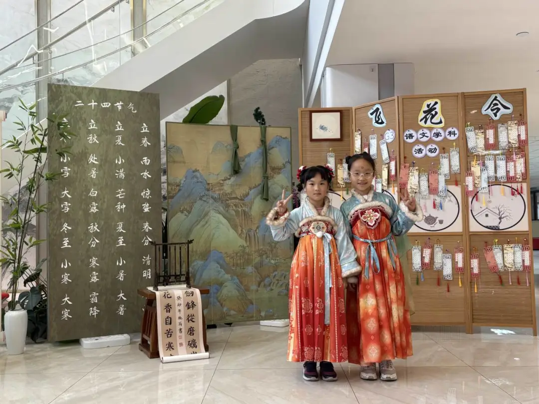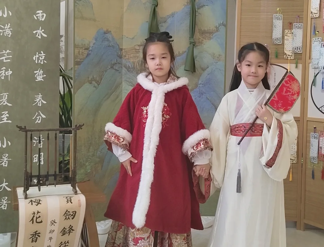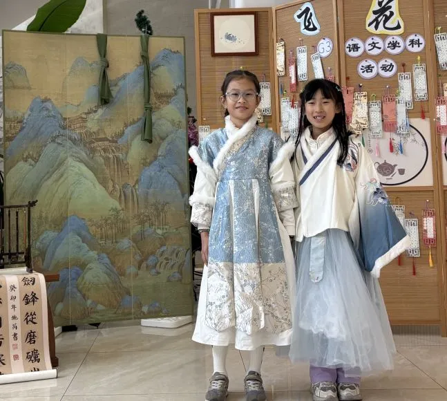 这场融合美学教育、语言训练与跨学科思维的文化盛宴,不仅让孩子们在沉浸式体验中触摸中华文明脉络,更通过项目式学习培养了文化自信与创新精神。四年级某位同学分享: " 当我穿上汉服吟诵诗词时,仿佛真的变成了古代的小书童,这种感觉很奇妙,也让我更爱我们的传统文化了。 "