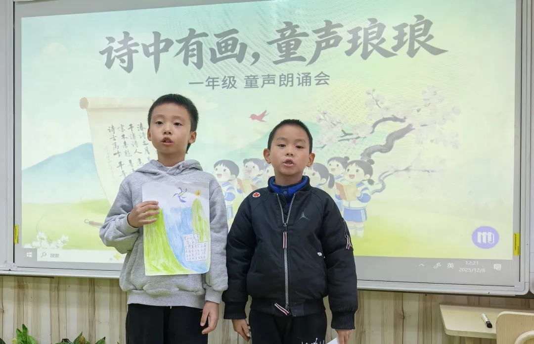 与此同时, · 话古今 活动也精彩纷呈。孩子们先以画笔描绘诗词中的画面,再声情并茂地吟诵。集体朗诵时,声音整齐又富有变化;个人展示时,情感真挚动人。他们用稚嫩的声音、灵动的画作,让古典诗词的意境与情感如春日繁花般在教室绽放,在心中种下文化传承的种子。