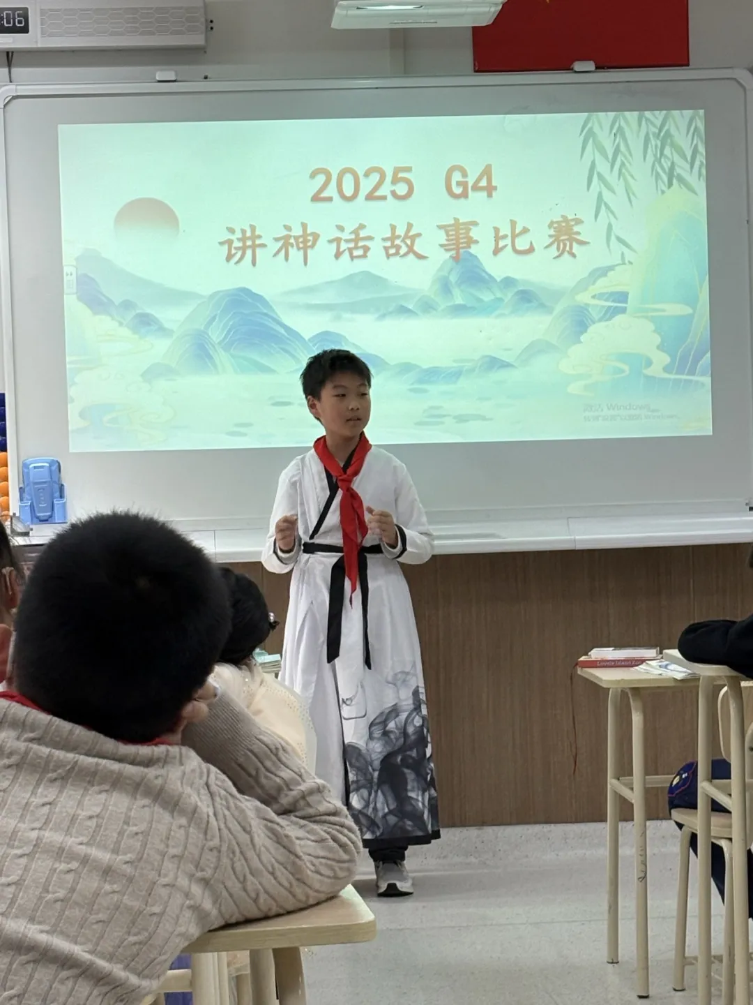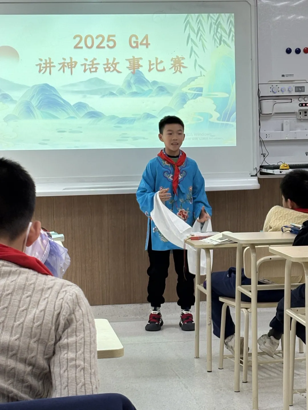 四年级的"讲神话故事比赛 " 将活动推向高潮。一群 小小故事家 用声情并茂的演绎,让沉睡千年的神话故事焕发新生!从盘古开天地的磅礴气魄,到嫦娥奔月的缱绻情思;从哪吒闹海的叛逆勇气,到愚公移山的坚韧执着,孩子们用童真视角重新诠释经典,为观众献上一场跨越古今的文化盛宴。