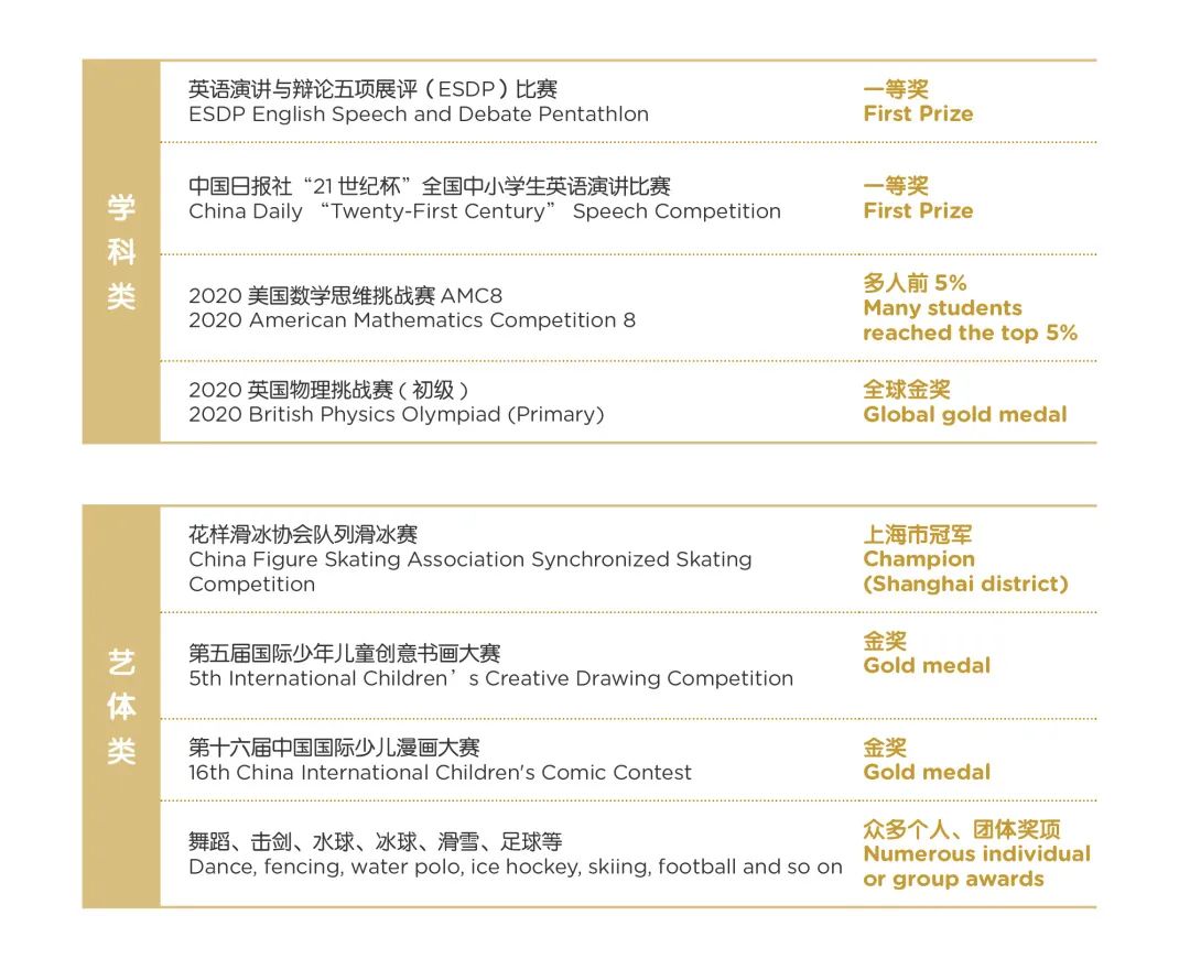 学校注重学生的全面发展和潜能开发,全校学生广泛参与校内外各类交流活动和比赛。2020学年共有364人次在各级别的高层次比赛中获得佳绩,涉及多个学科和领域,如: